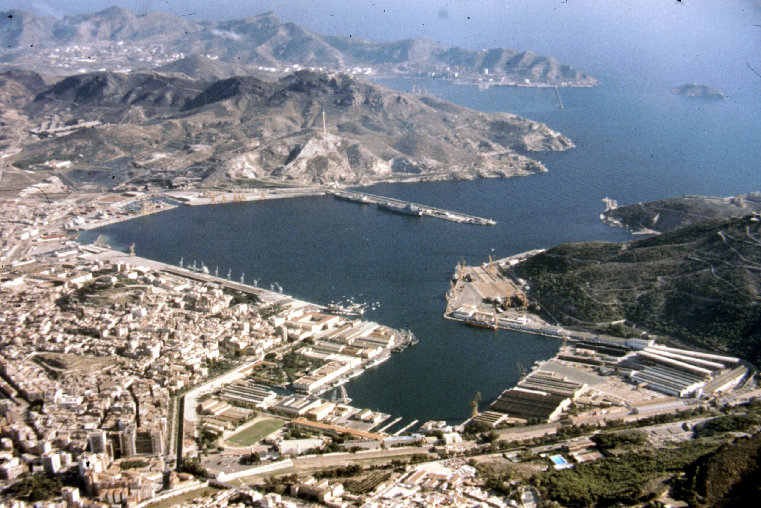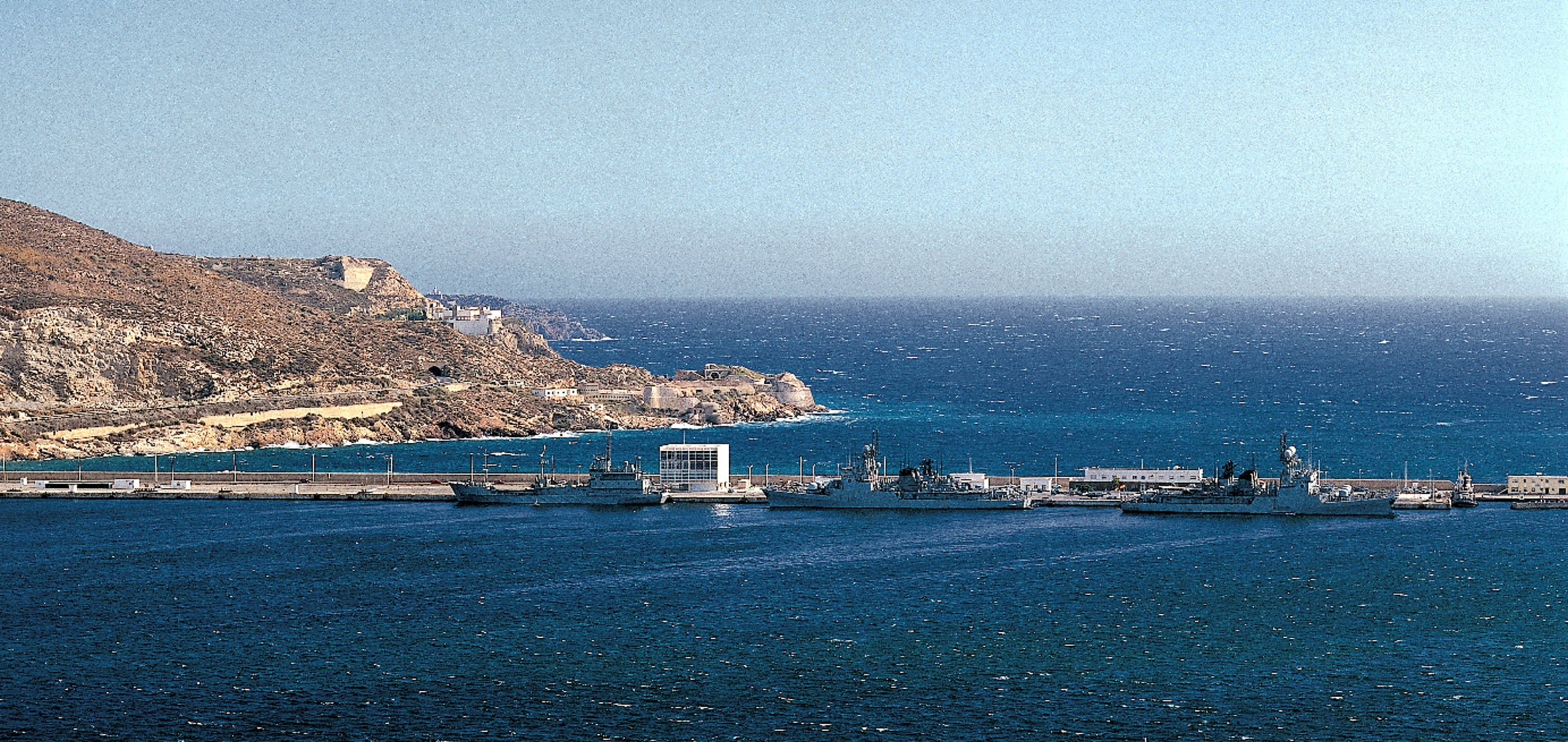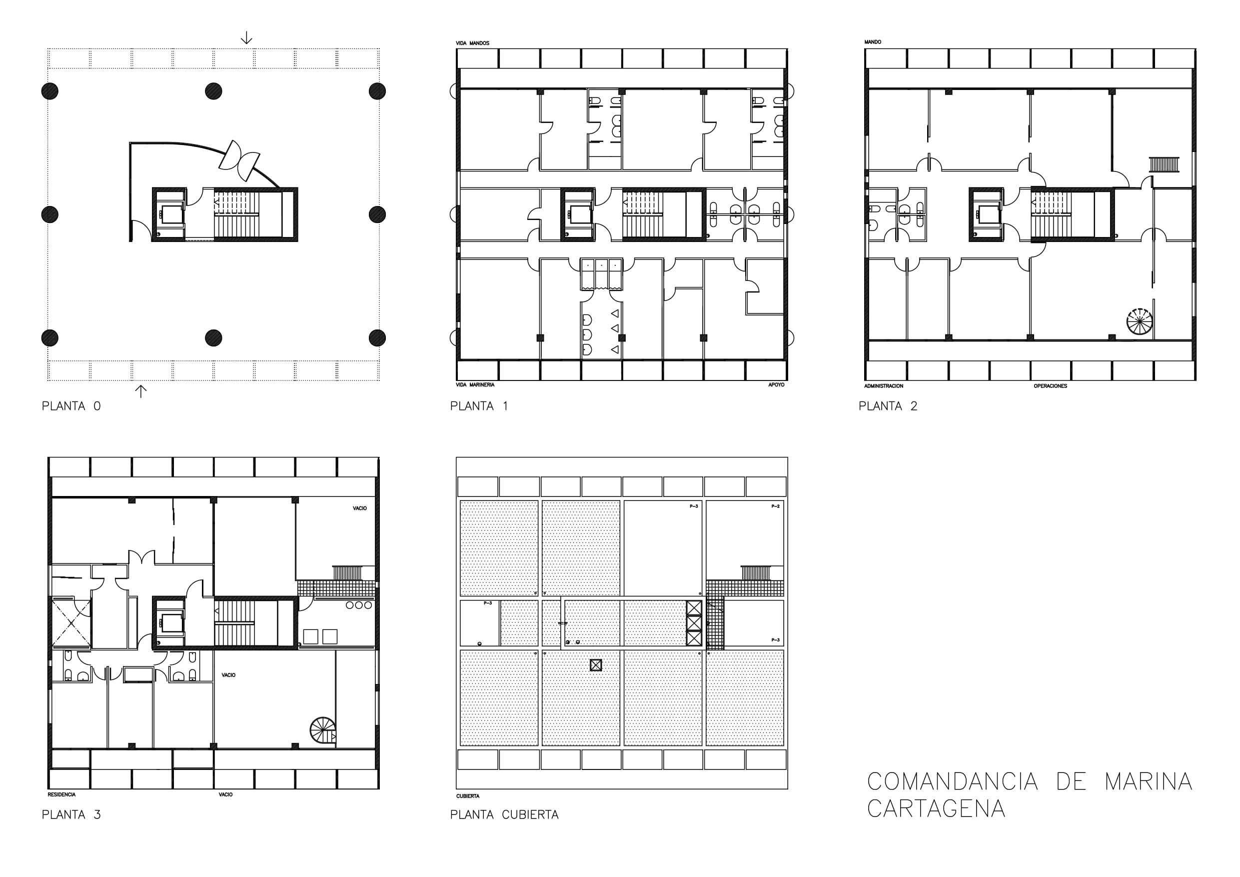 Un cubo sobre el brazo que separa el puerto del mar, un prisma de hormigón blanco 20 x 20 levantado sobre 9 pilotes PI (¢ 1 metro, perímetro p). Seis fachadas en total: cuatro verticales y dos horizontales. Dos caras de vidrio, al norte y al sur, hacia Cartagena y el Mediterráneo, resguardadas por brise-soleils. Las cuatro restantes prácticamente ciegas: las dos verticales lisas, mientras que las dos horizontales aparecen reticuladas.