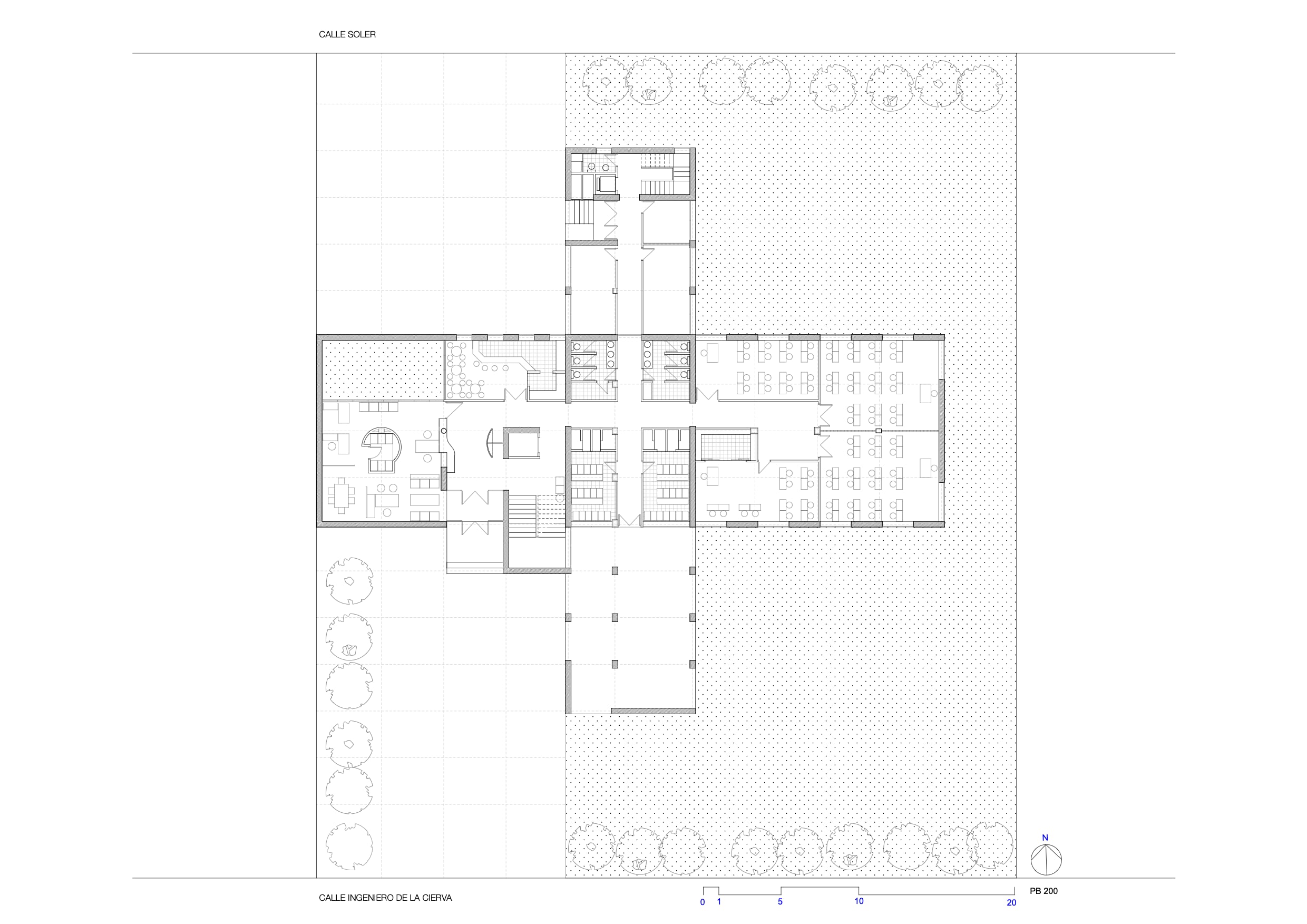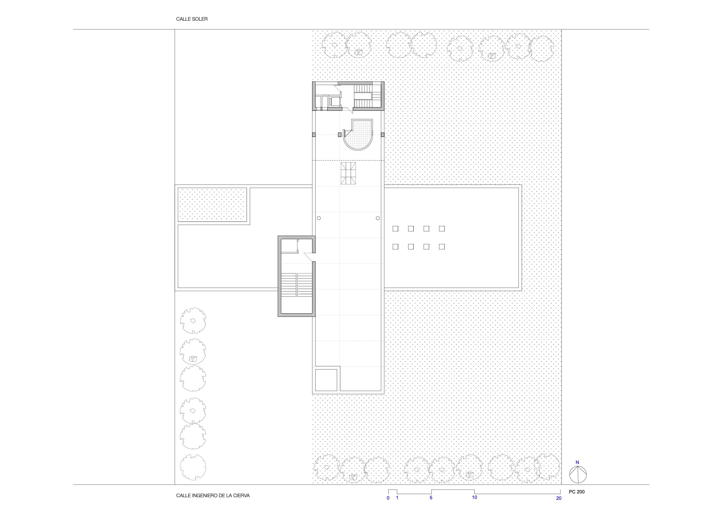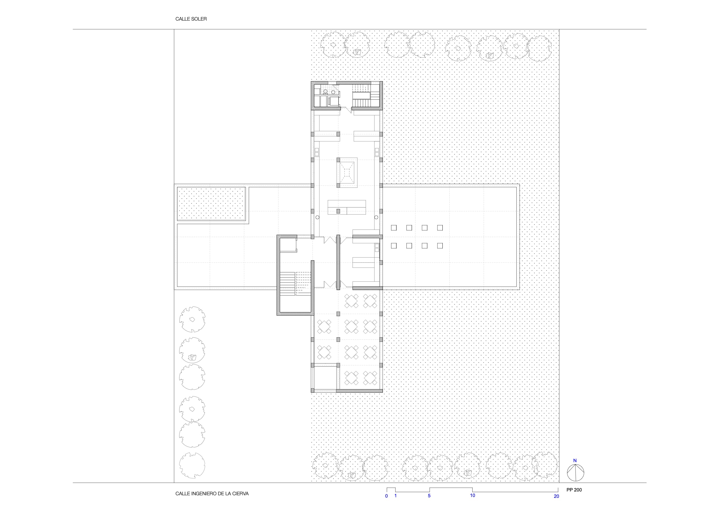 Tres ejes cartesianos con tres usos: Estancias , maquinas y circulaciones. La cruz traza cuatro patios, uno delantero para acceso y otro trasero oculta servicios. La durabilidad con escaso mantenimiento, sugirió ladrillos a dos caras: de nuevo una estricta modulación. Ni un ladrillo partido